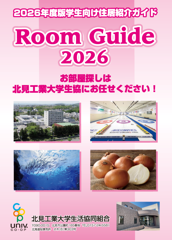 北見工大生協ルームガイドコーナーでは、年に一度・年末頃に「学生向け住居紹介ガイドブック【Room Guide】を発行しています。